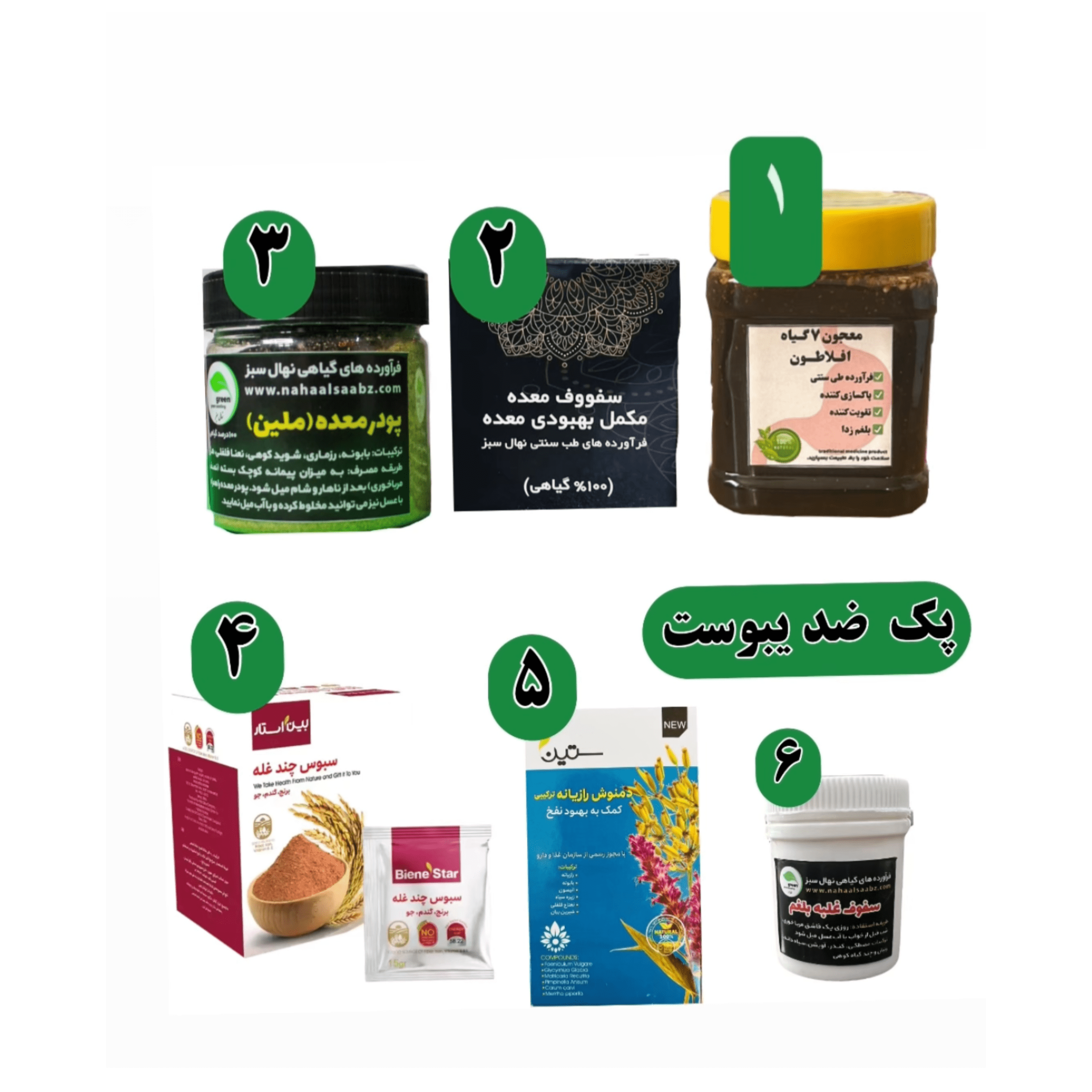 ۱-معجون افلاطون ۷گیاه حاوی سیرسیاه ۲-پودرسفووف معده ۳-پودر ملین معده ۴-سبوس چن غله (گندم ،جو ،برنج) ۵-دمنوش ۳۰ عددی نفخ معده ۶- پودر ضدبلغم ۲عدد